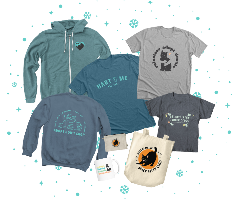 We’re excited to share that our brand new HART merchandise store is live on Bonfire! Every tee, hoodie, tote, and mug helps support HART’s mission to rescue, care for, and find homes for cats in need. Show your love for HART cats and wear it proudly. HART merch also makes the purrfect gift for the cat lovers on your list!