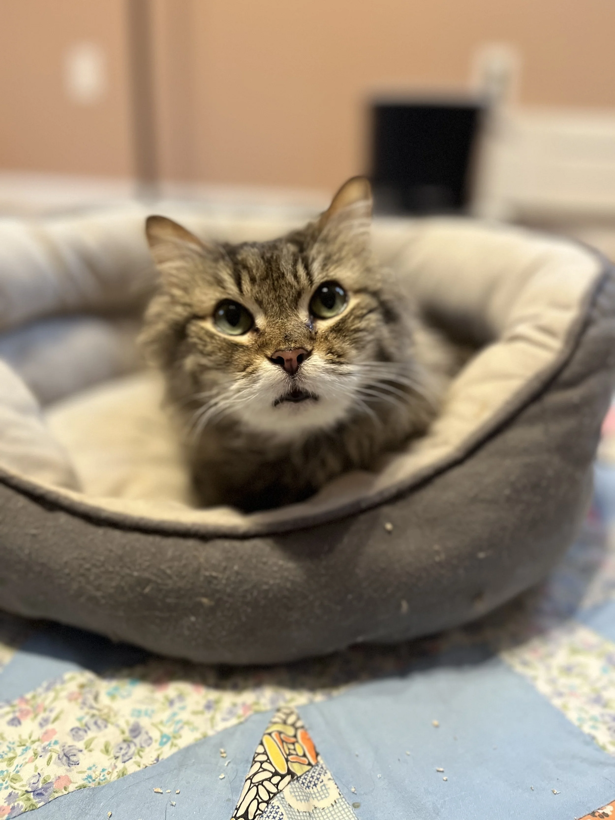 When 15-year-old Speck arrived at her new home, she walked in like she owned the place, exploring every corner and quickly claiming a guest room as her kingdom. Full of personality and totally comfortable expressing herself, she will tap a family member’s leg if dinner is late, wave her paw for attention, and race to the top of her cat tree to greet her adopters face to face. Between naps in her Cuddler bed and cozy snuggles under the blanket with her new humans, she loves watching the world from the window and enjoying her wonderful new life.